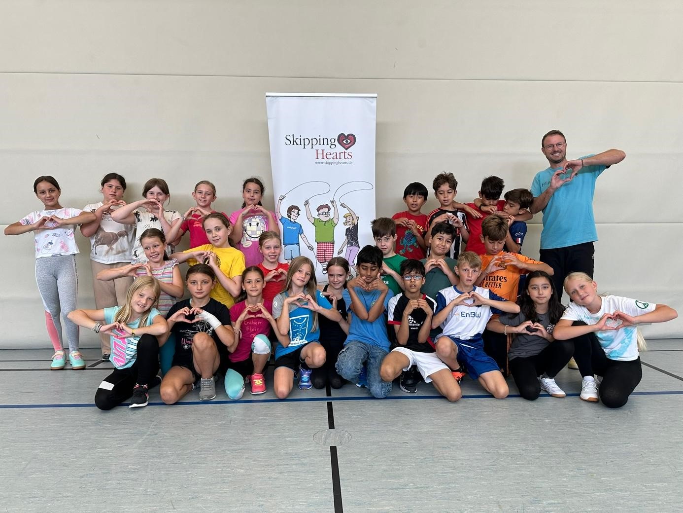8. September 2025Am 29. Juli 2025 nahm die Klasse 4c der Schillerschule Walldorf am Workshop „Skipping Hearts“ teil. Seilspringen macht Schule ist das Motto des kostenlosen Präventionsprojekts der Deutschen Herzstiftung. Der Workshop Leiter Filip Panic vermittelte Kind- und schulgerecht in 90 Minuten die Grundtechniken des Rope Skippings. Zum Abschluss gab es eine kleine Aufführung, zu der interessierte Eltern und andere Schulklassen eingeladen wurden sowie ein freies Springen, bei dem sich auch die Zuschauerkinder und Eltern an den Seilen ausprobieren konnten. Es waren alle Kinder begeistert und aktiv beim Seilspringen am Start. Ein herzliches Dankeschön von uns allen an den Workshop Leiter Filip!