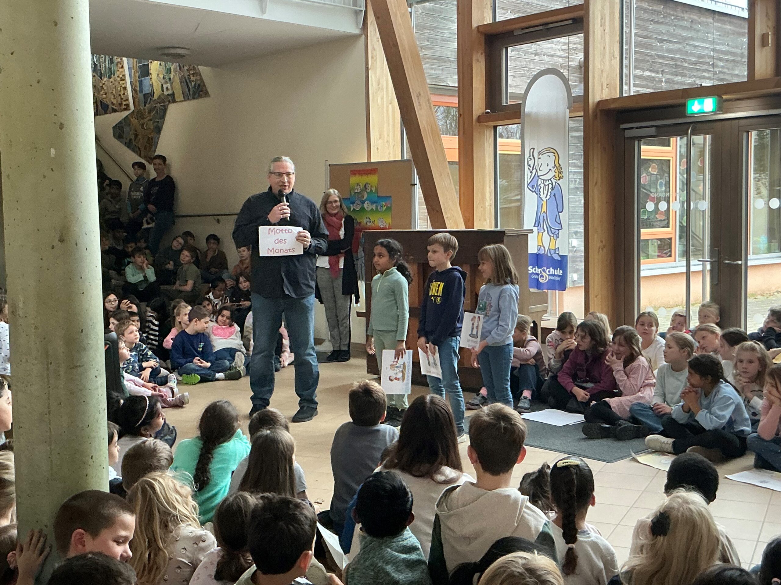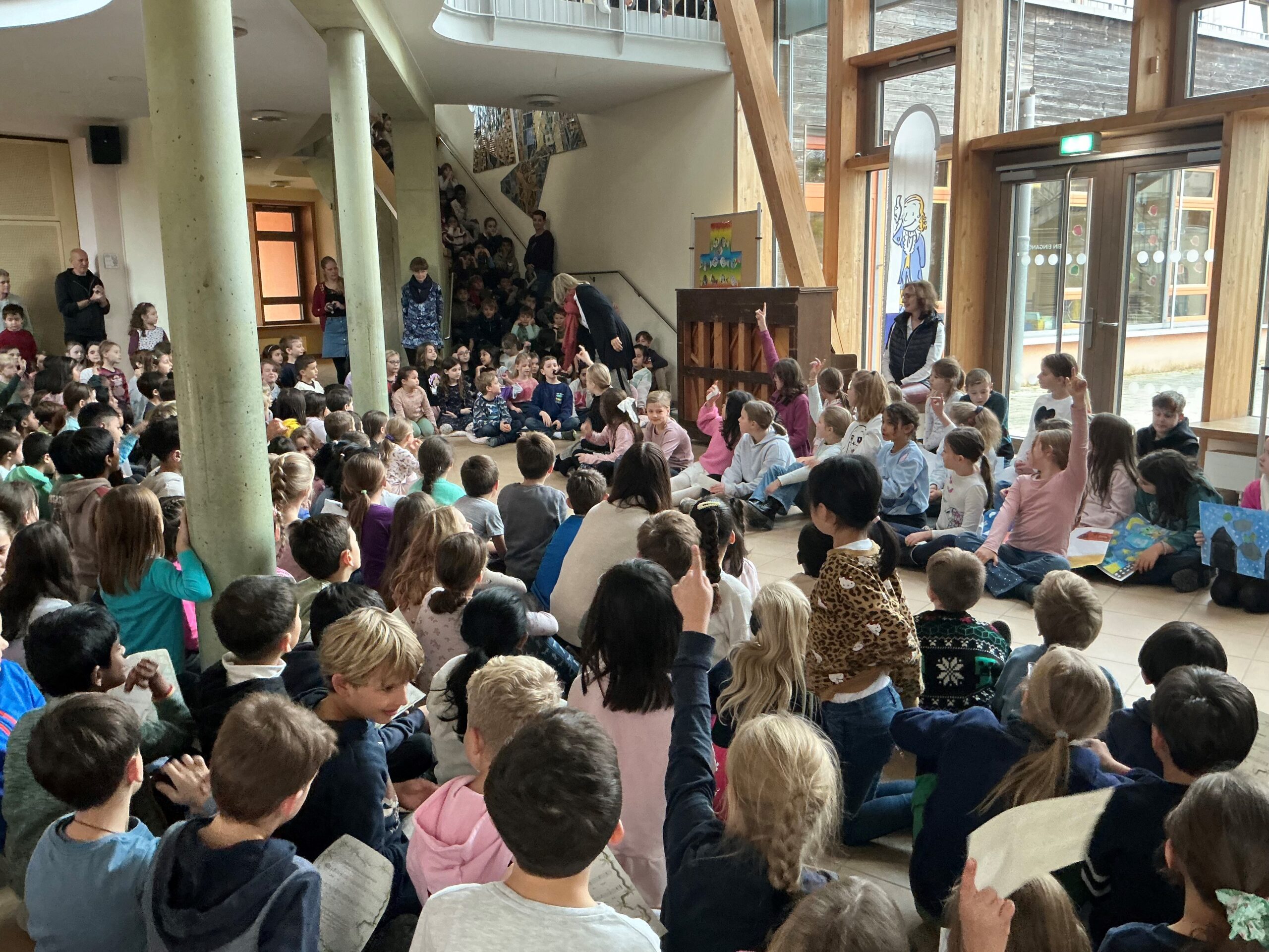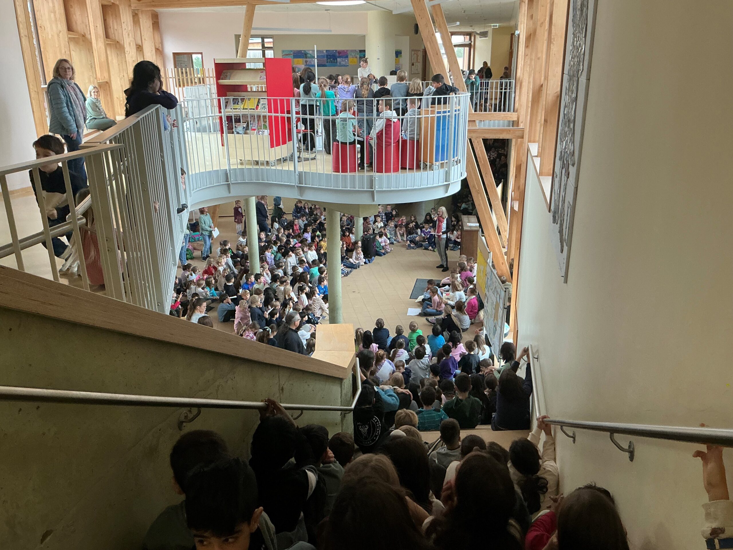 Am Freitag trafen sich alle Schülerinnen und Schüler zum Abschluss der Projektwoche im Foyer, wo alle Klassen gemeinsam sangen und ihre Arbeiten vorstellten.